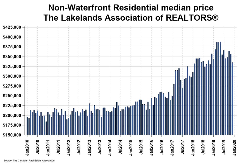 The median price for waterfront property sales in December 2019 was $500,010, falling 20% from December 2018. The annual median price for 2019 was $540,000, rising by 3.6% from 2018.